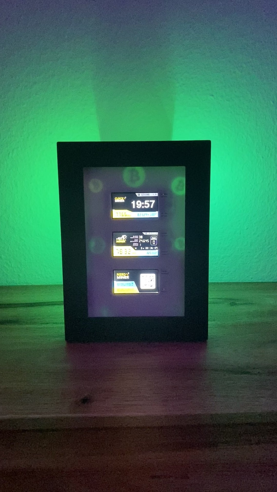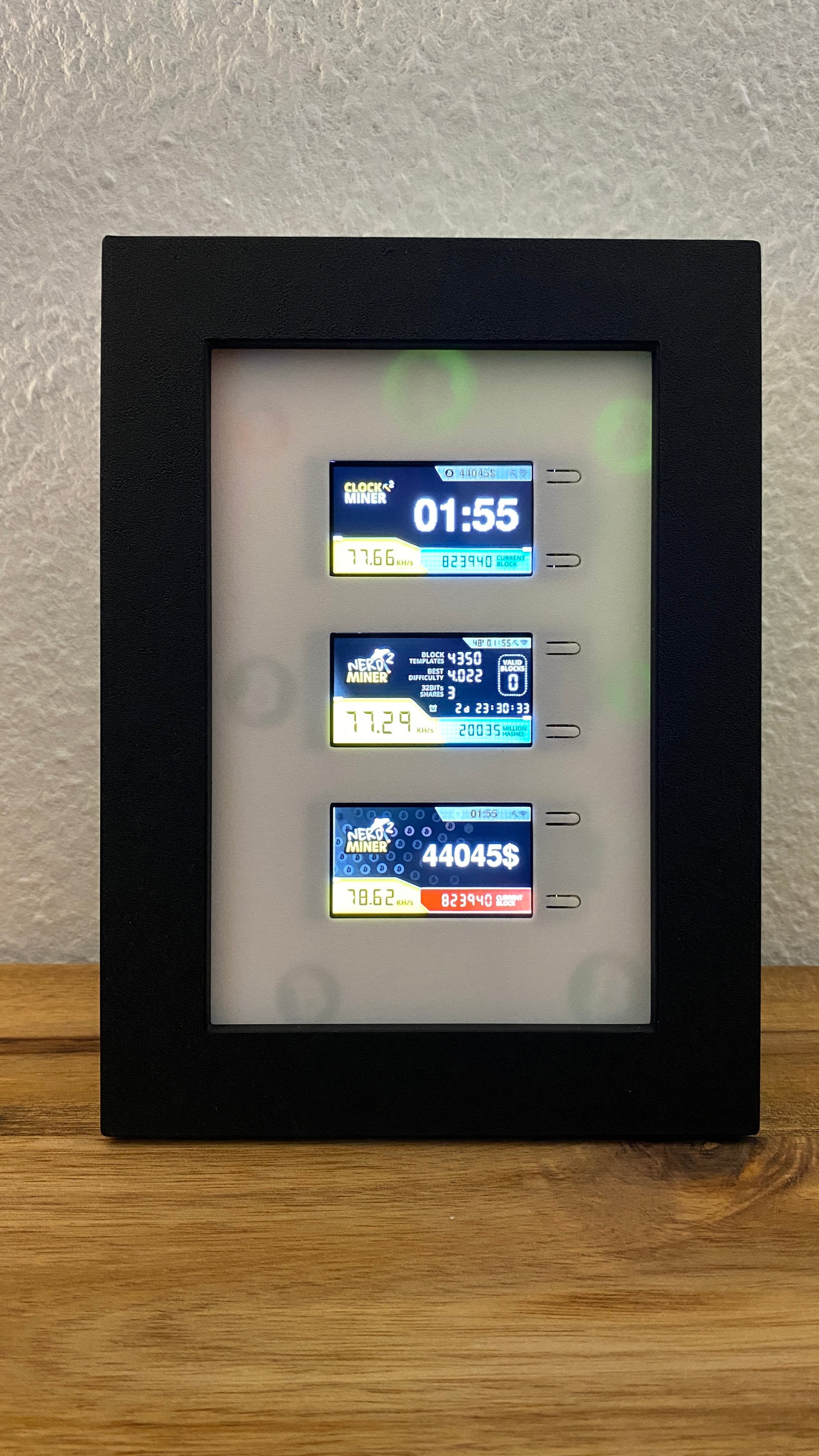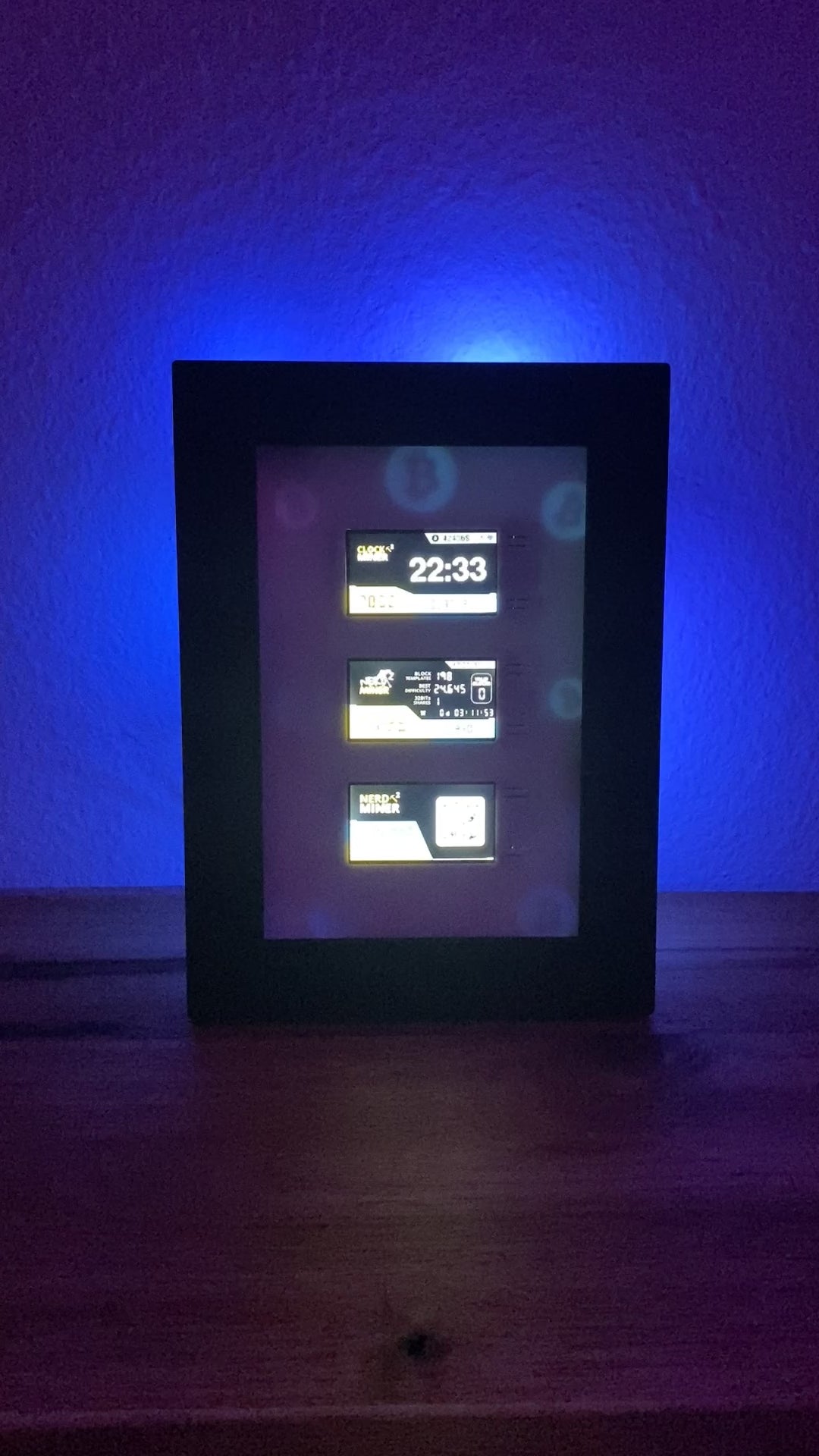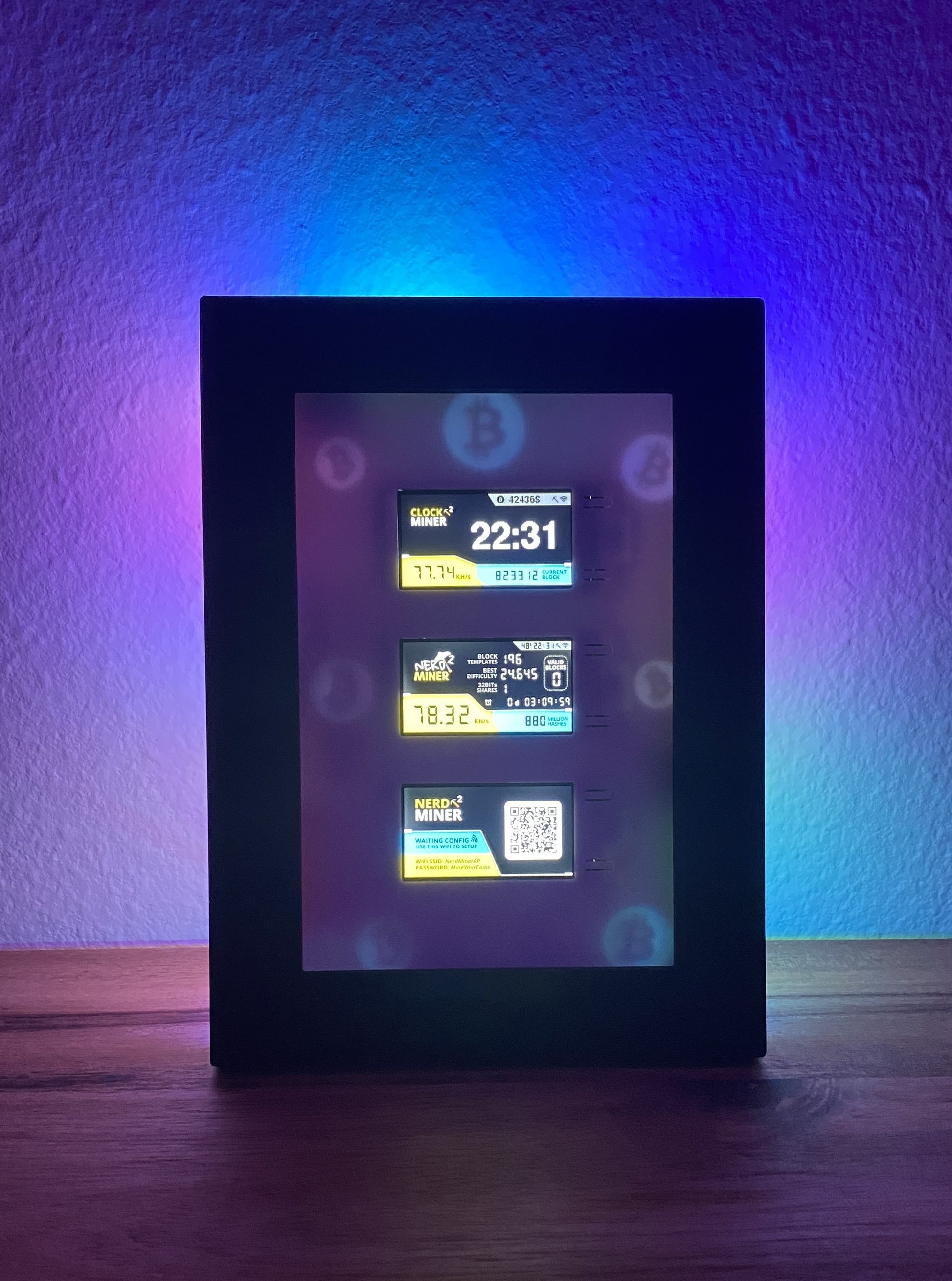 Three NerdMiners set in a frame to stand or hang up. Optionally also with adjustable backlight. Hundreds of different colors and effects can be set via any web browser.