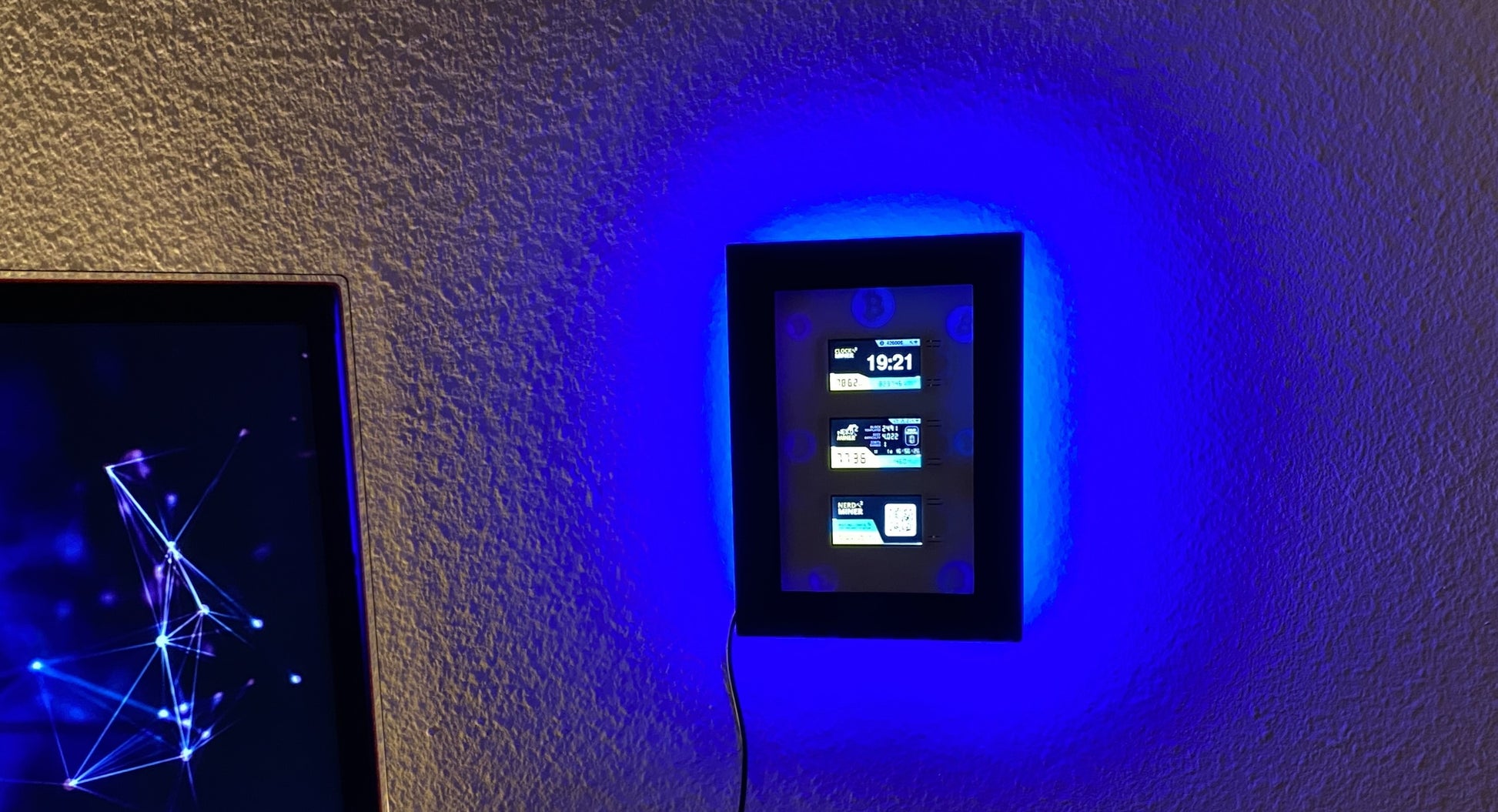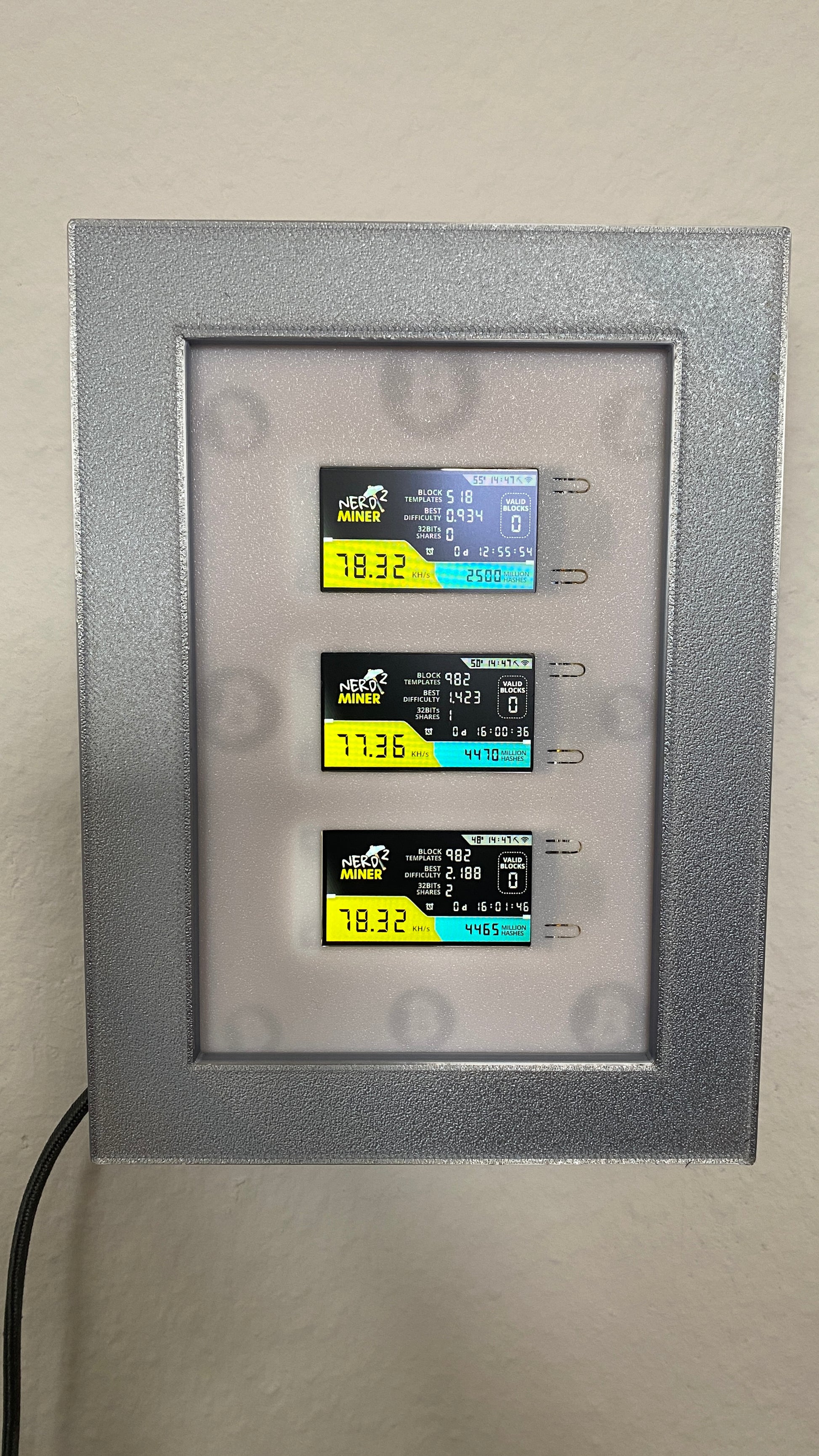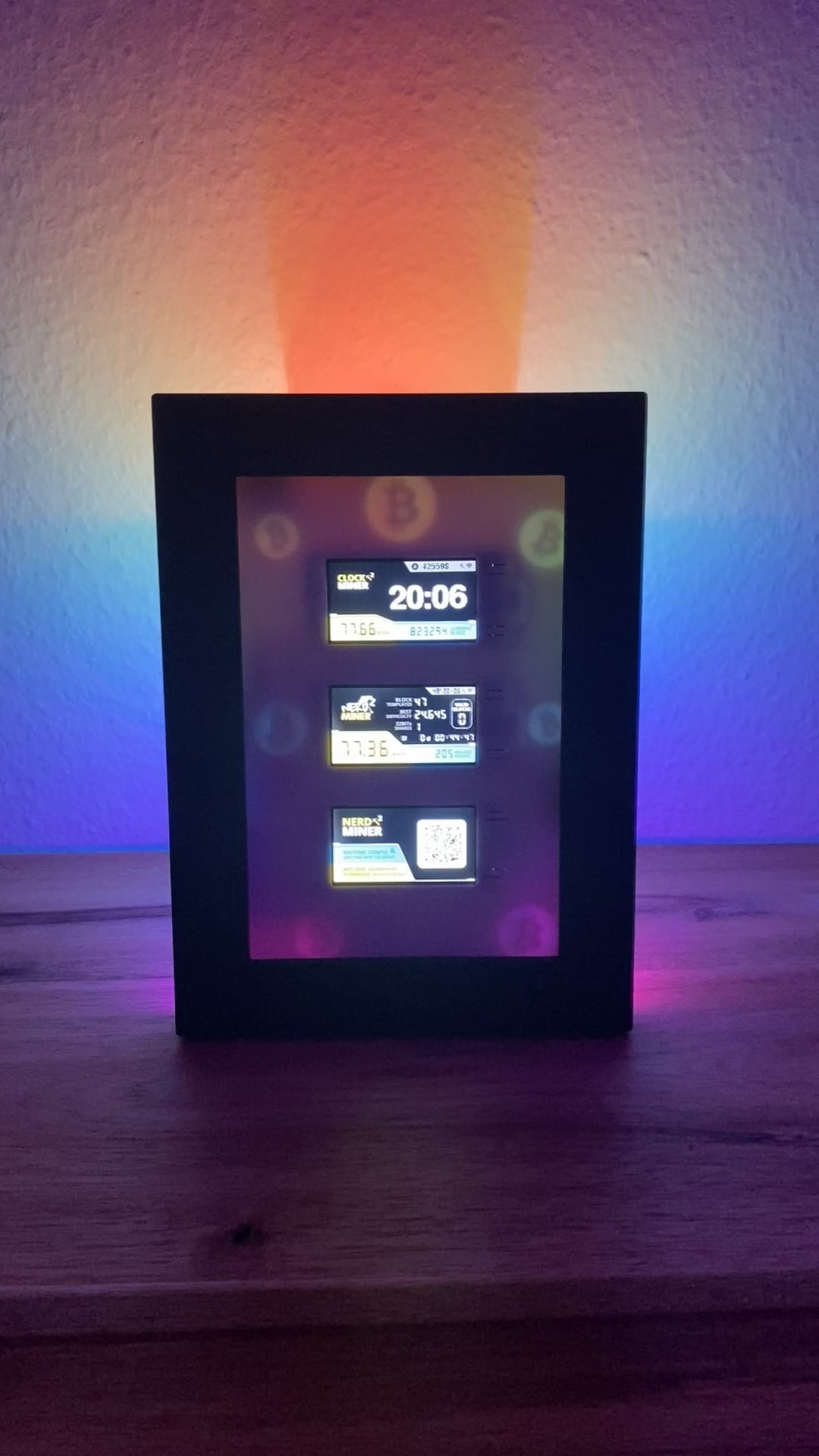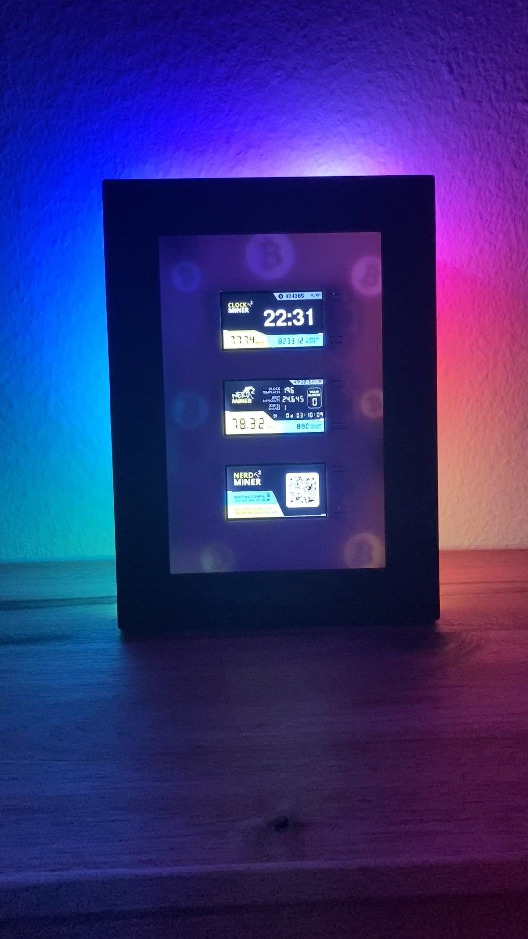 Three NerdMiners set in a frame to stand or hang up. Optionally also with adjustable backlight. Hundreds of different colors and effects can be set via any web browser.